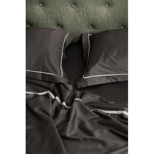 Комплект постільної білизни двоспальний євро з преміум сатину. Склад - 100% бавовна. Колір - темно-сірий з оздобленням світло-сірого кольору. В комплект входить дві наволочки 50х70, півковдра 200х220, простирадло 220*240. Наволочки темно-сірого кольору оздоблені рамочкою світло-сірого кольору, мають карман. Півковдра з верхньої сторони темно-сірого кольору, оздоблена рамочкою світлого-сірого кольору, має застібку "блискавка". Простирадло темно-сірого кольору, Можлива комплектація з простирадлом світло-сірого кольору або простирадлом на резинці.