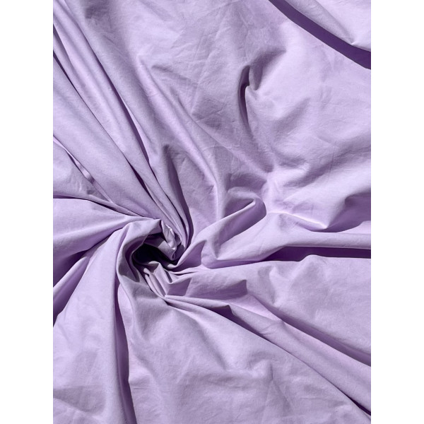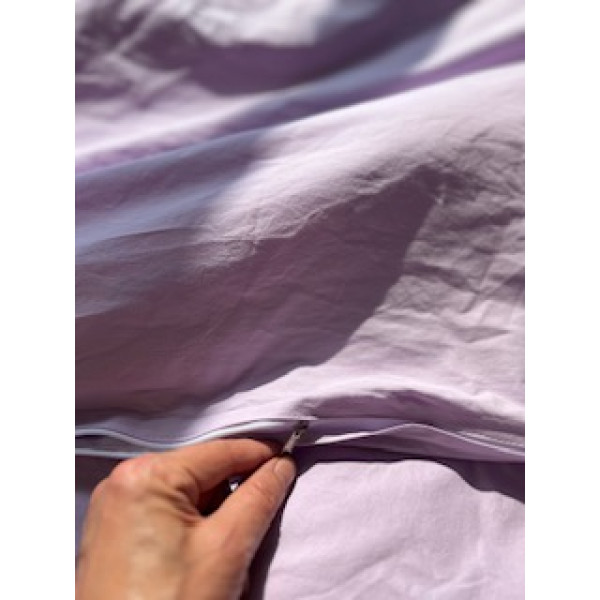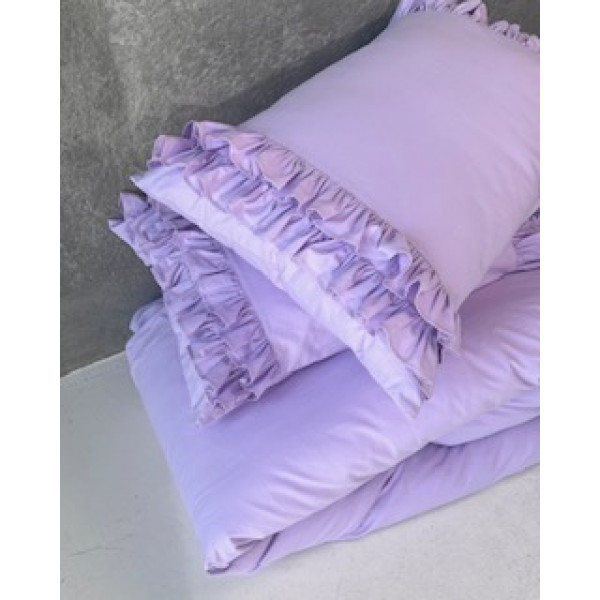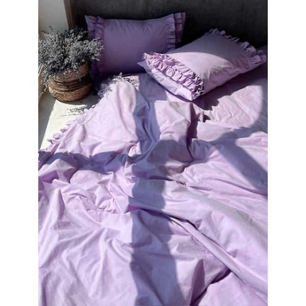 Комплект постільної білизни двоспальний. Матеріал - варена бавовна, Склад - 100% бавовна. Колір ліловий. В комплект входять дві наволочки 50*70, півковдра 180*200, простирадло 220*240. Наволочки оздоблені рюшем, мають карман. Півковдра оздоблена рюшем, має застібку "блискавку". Можлива комплектація з простирадлом на резинці.